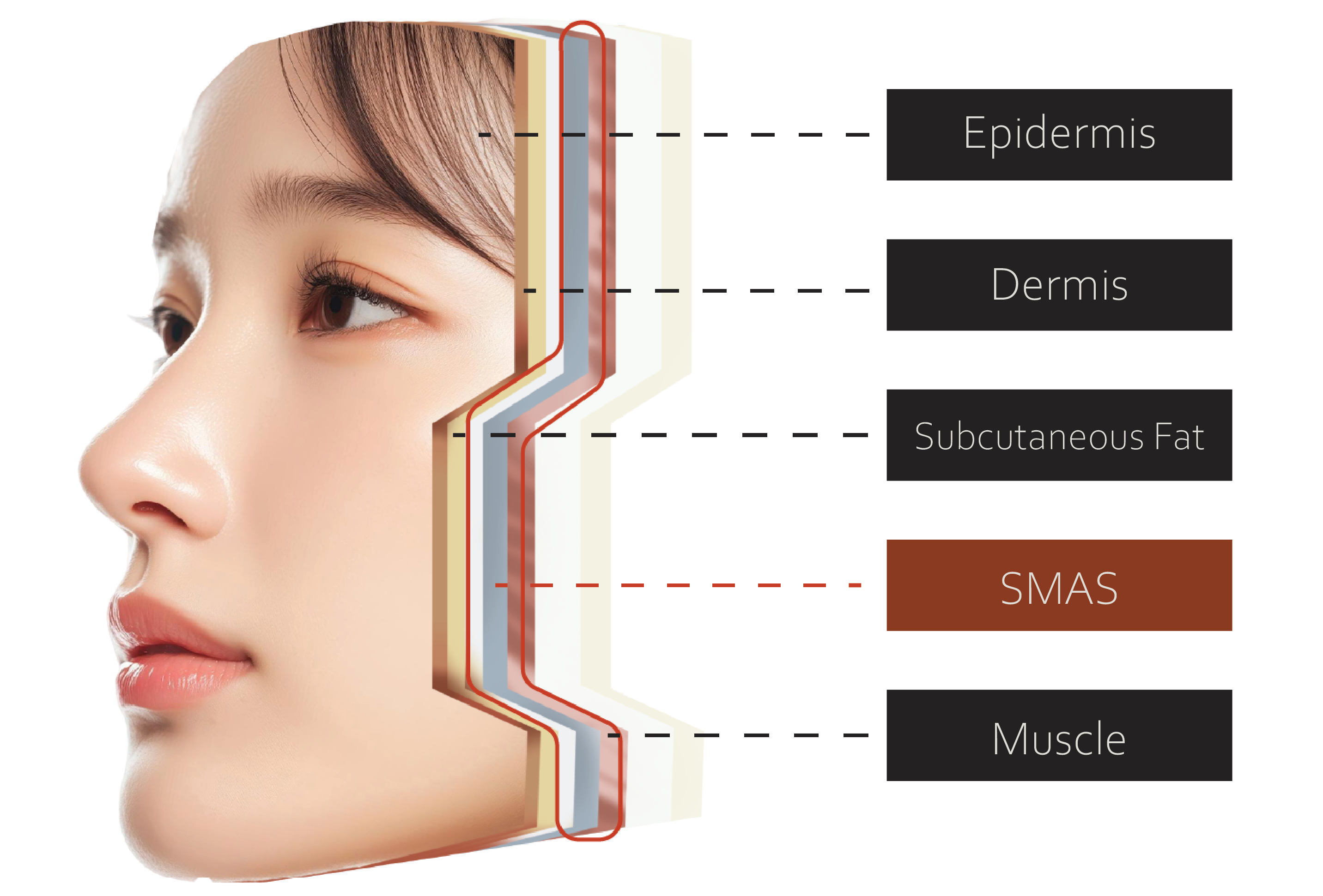 SMAS (Superficial Musculoaponeurotic System) layer weakens in it support as we age. Its ability to hold up facial muscles, fat and skin will diminish over time, resulting in facial wrinkles and saggy face.